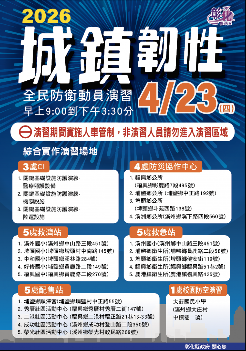 彰化縣政府謹訂於115年4月23日(星期四)於福興鄉、埔鹽鄉、埤頭鄉、溪州鄉等4個鄉(鎮、市)辦理彰化縣2026城鎮韌性(全民防衛動員)演習